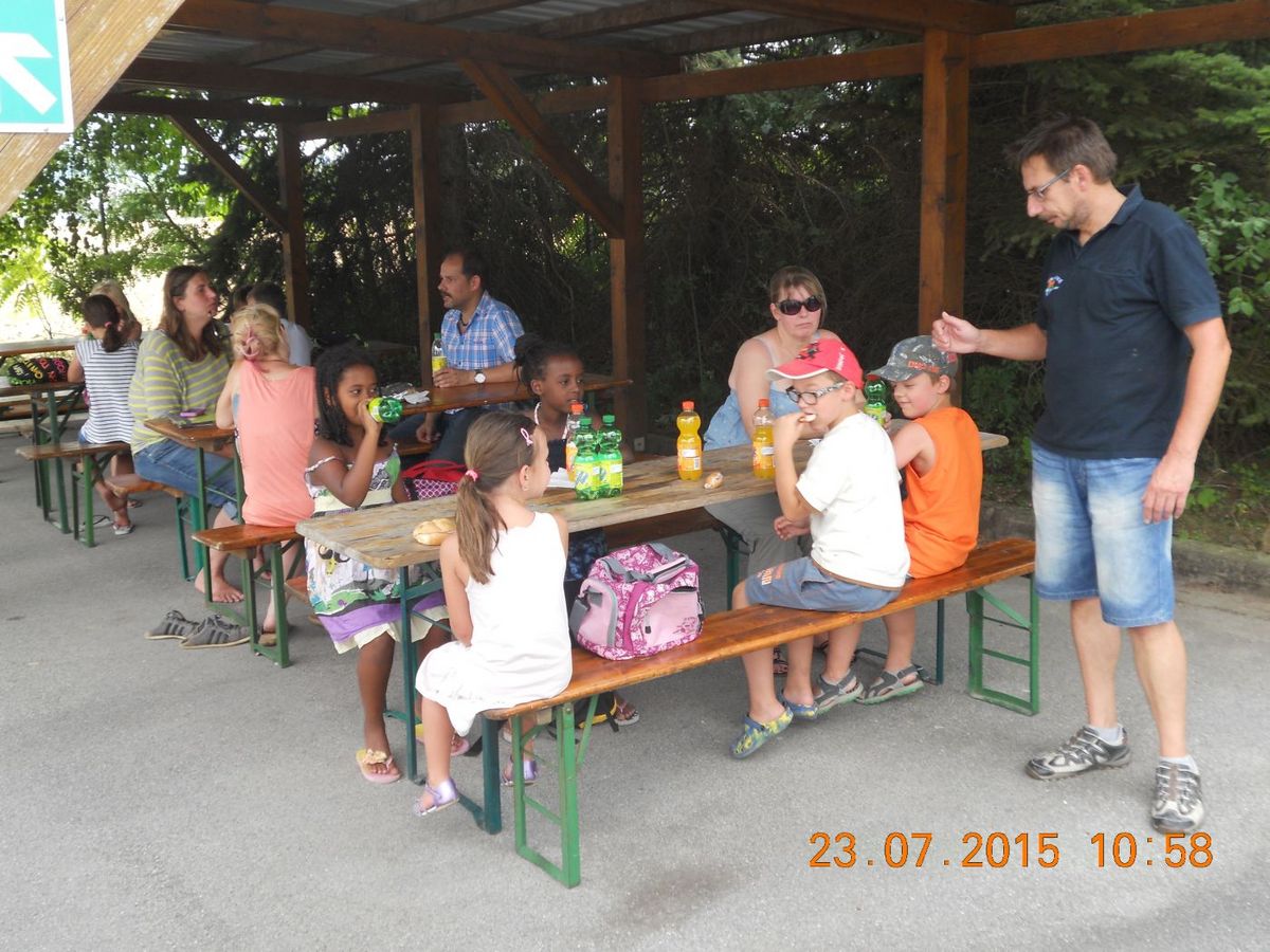 Zurück auf der Kläranlage gab es an einem schattigen Plätzchen erst eine Stärkung, bevor sich die Kinder über Ausmalbilder und das Kläranlagenquiz stürzten.