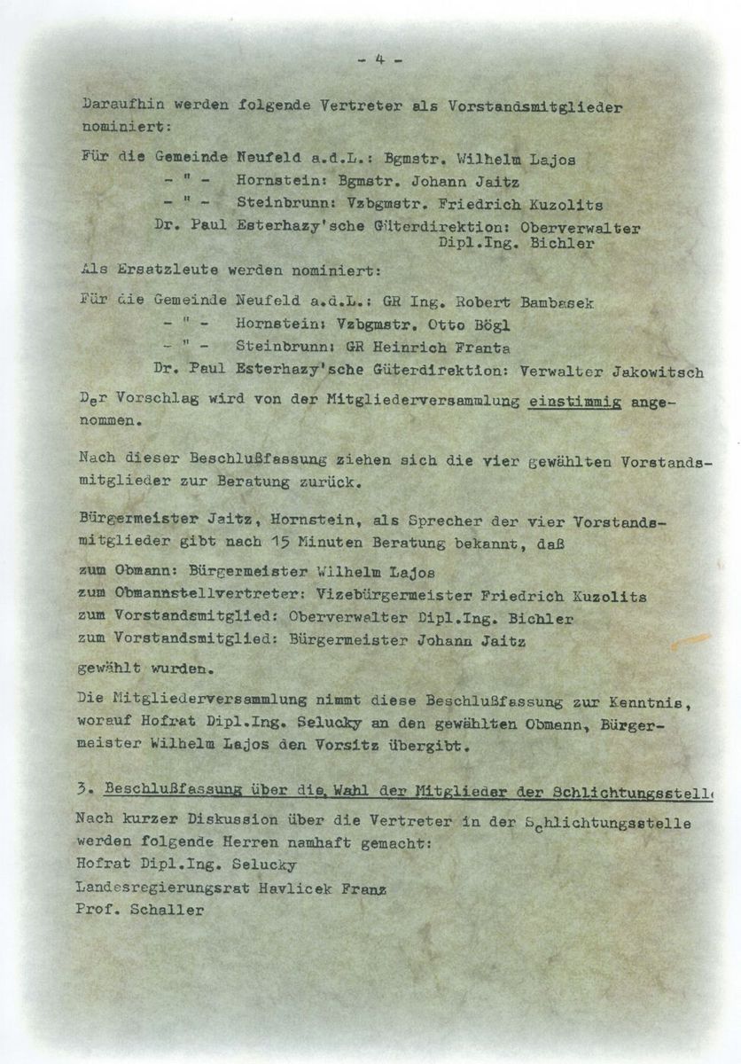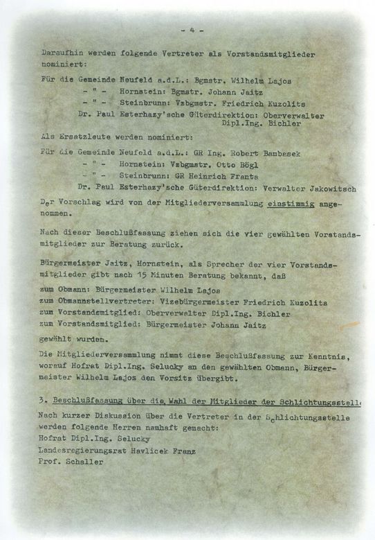 Der erste Vorstand setzte sich wie folgt zusammen:- Bgm. Wilhelm Lajos (Gemeinde Neufeld/L.) - Obmann