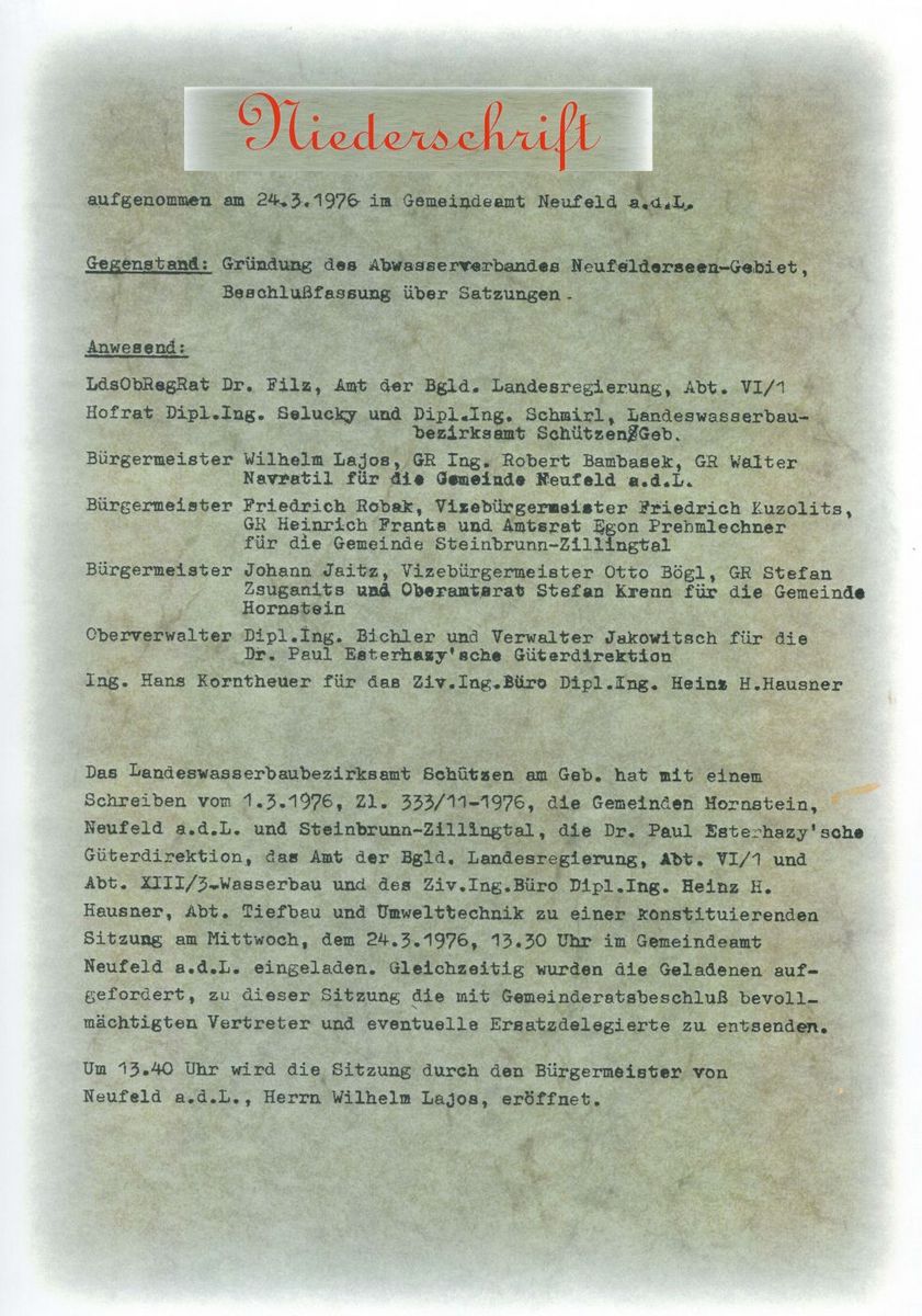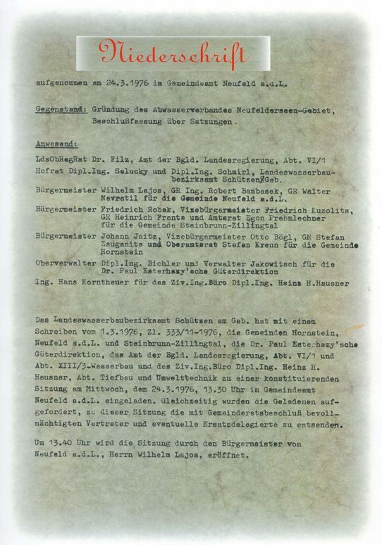 Verbandsgründung und konstituierende Sitzung unter der Bezeichnung "Abwasserverband Neufelderseen-Gebiet".