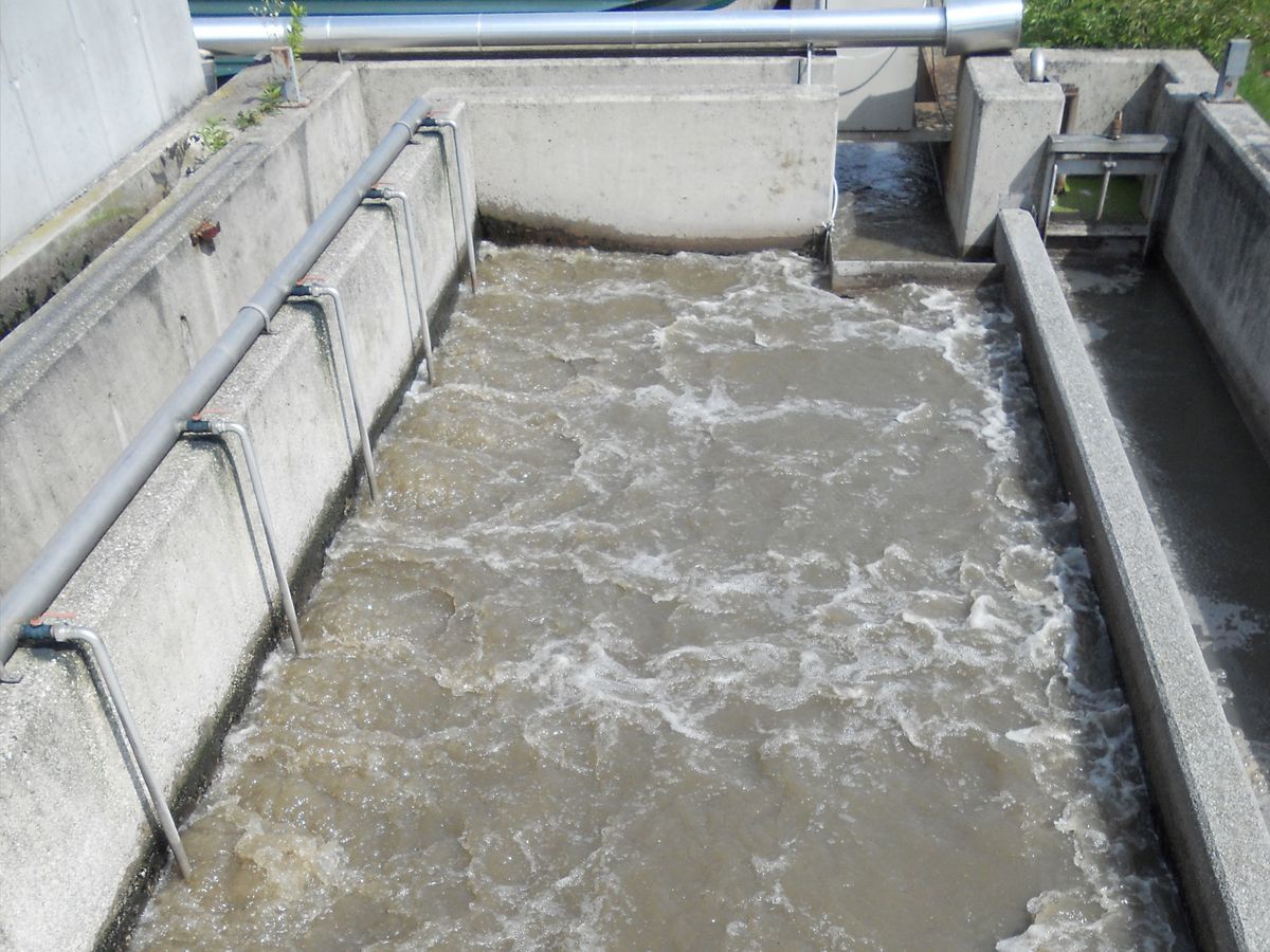 Im Belebungsbecken findet nun die eigentliche biologische Reinigung des Abwassers statt. Die im Belebtschlamm vorhandenen Mikroorganismen werden durch Zufuhr von Sauerstoff über die Rotoren zum Verzehr der Kohlenstoffverbindungen angeregt. Durch Abschalten der Sauerstoffzufuhr über die Rotoren werden für andere Mikroorganismen optimale Zustände für die Entfernung der Stickstoffverbindungen erreicht. Wir nennen das Nitrifikation und Denitrifikation. Dazu befinden sich 3 Online-Messsonden im Becken, die die Informationen für die automatische Regelung durch das Leitsystem zur Verfügung stellen.