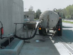 Beispielgebend ist die Art der Klärschlammverwertung mit Ihrer Kreislaufwirtschaft. Dazu beschreiten wir mehrere Wege. Früher wurde mit einen 10 m3 Tank der Klärschlamm zur Aufbringungsstelle gebracht und mit einem Schlauchsystem gleichmäßig in der für die Düngung des Feldes erforderlichen Menge aufgebracht (siehe Foto). Bei lang anhaltendem Regen, während der Vegetationsperiode und während der Verbotszeiten kann aber kein Nassschlamm ausgebracht werden kann. Darum haben wir aktuell hauptsächlich den 2. Weg in Verwendung, bei der der Klärschlamm maschinell in der Kläranlage entwässert und in der Solaren Trocknung für die weitere Verwendung (z.B. Aufbringung mit Düngestreuern oder Kompostierung) zwischengelagert wird.