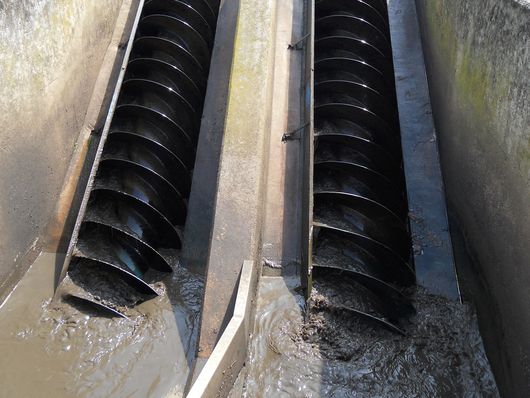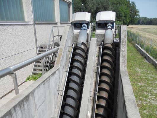 Im Rücklaufschlammhebewerk sind zwei Schneckenpumpen für den Transport des Belebtschlammgemisches (in dieser Phase sprechen wir von Rücklaufschlamm) aus den Nachklärbecken zuständig. Der Rücklaufschlamm wird wieder in das Anaerobbecken (Station 6) gepumpt, mit dem frischen Abwasser intensiv vermischt, und der Kreislauf der Reinigung beginnt erneut.