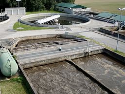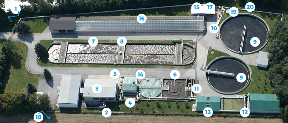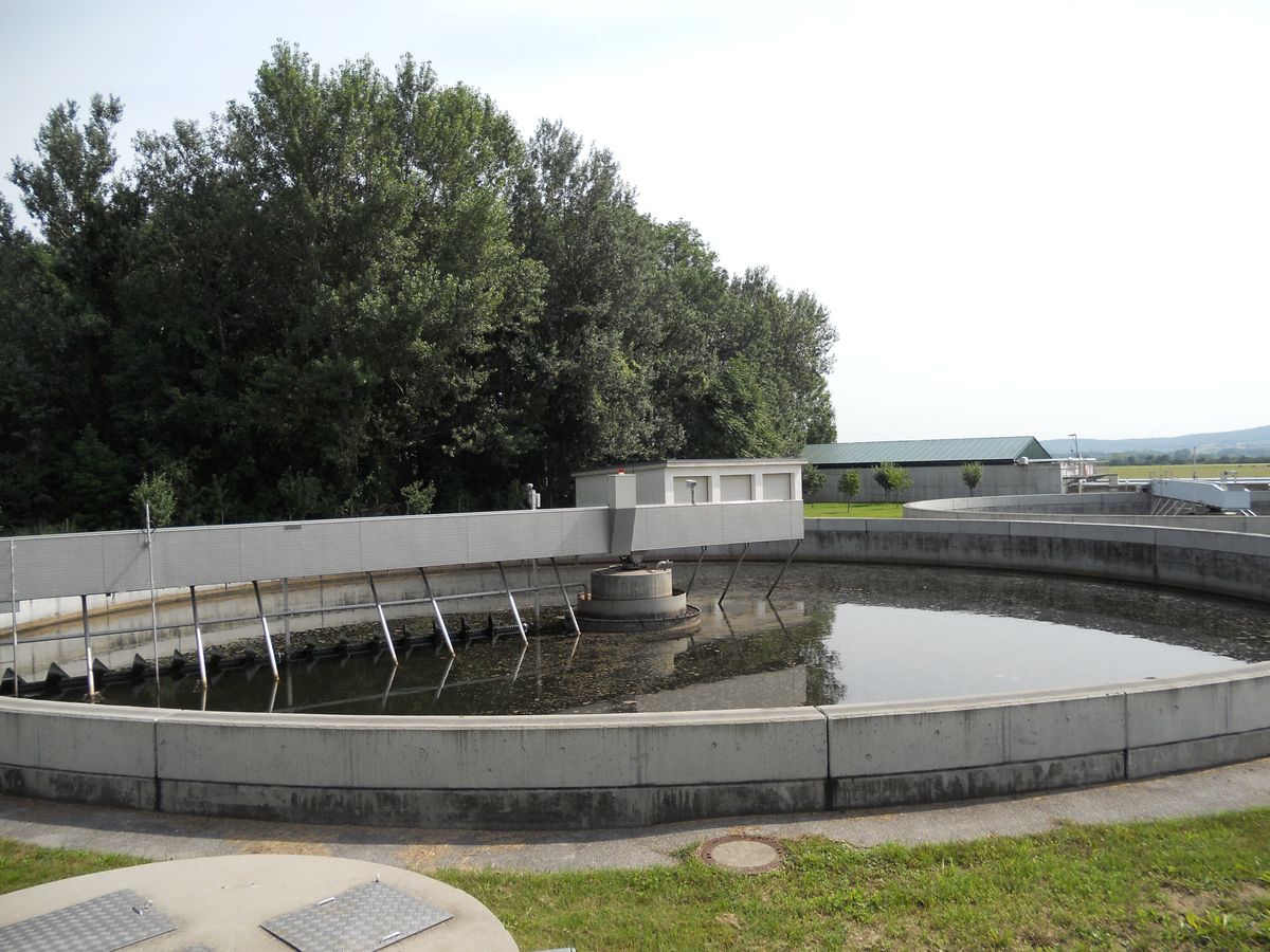 An der Oberfläche der Nachklärbecken entsteht die Klarwasserzone. Über ein Ablaufsystem (Tauchring) wird ohne Verwirbelung mit der Schlammzone das gereinigte Abwasser in den sogenannten Vorfluter, die Leitha, abgeleitet.